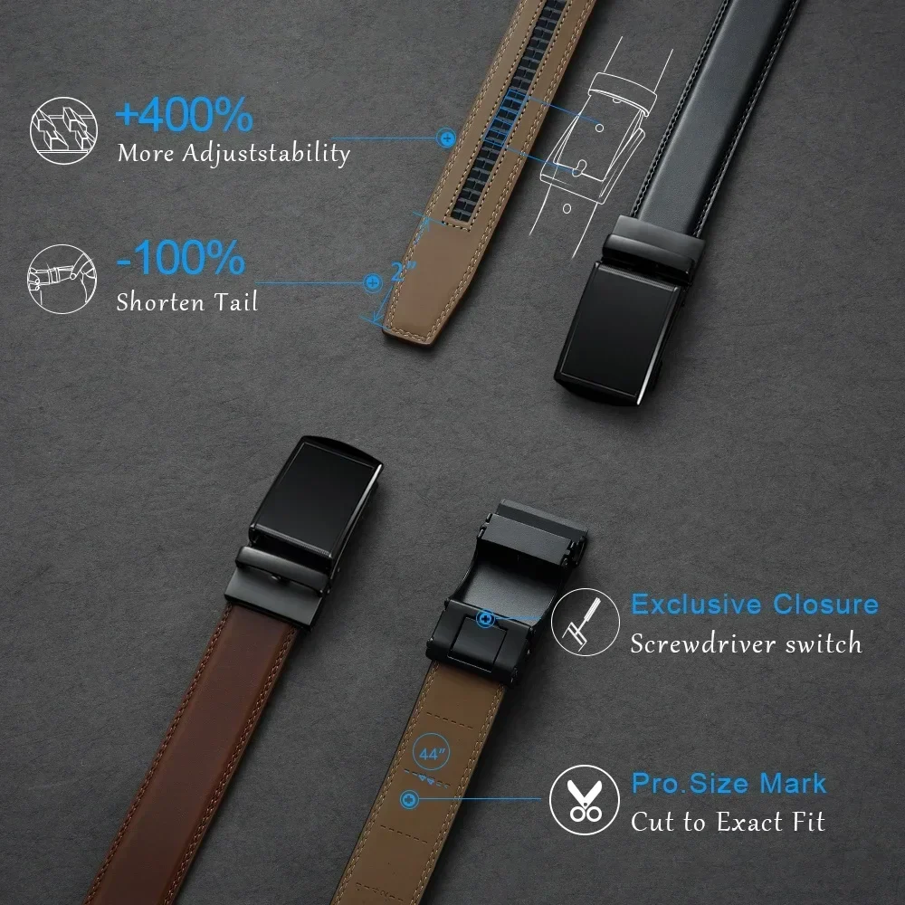 Leather Ratchet Belt for men – adjustable 110-130cm, hole-free buckle, premium leather. Easy to customize, stylish for all occasions, in a luxury gift box.