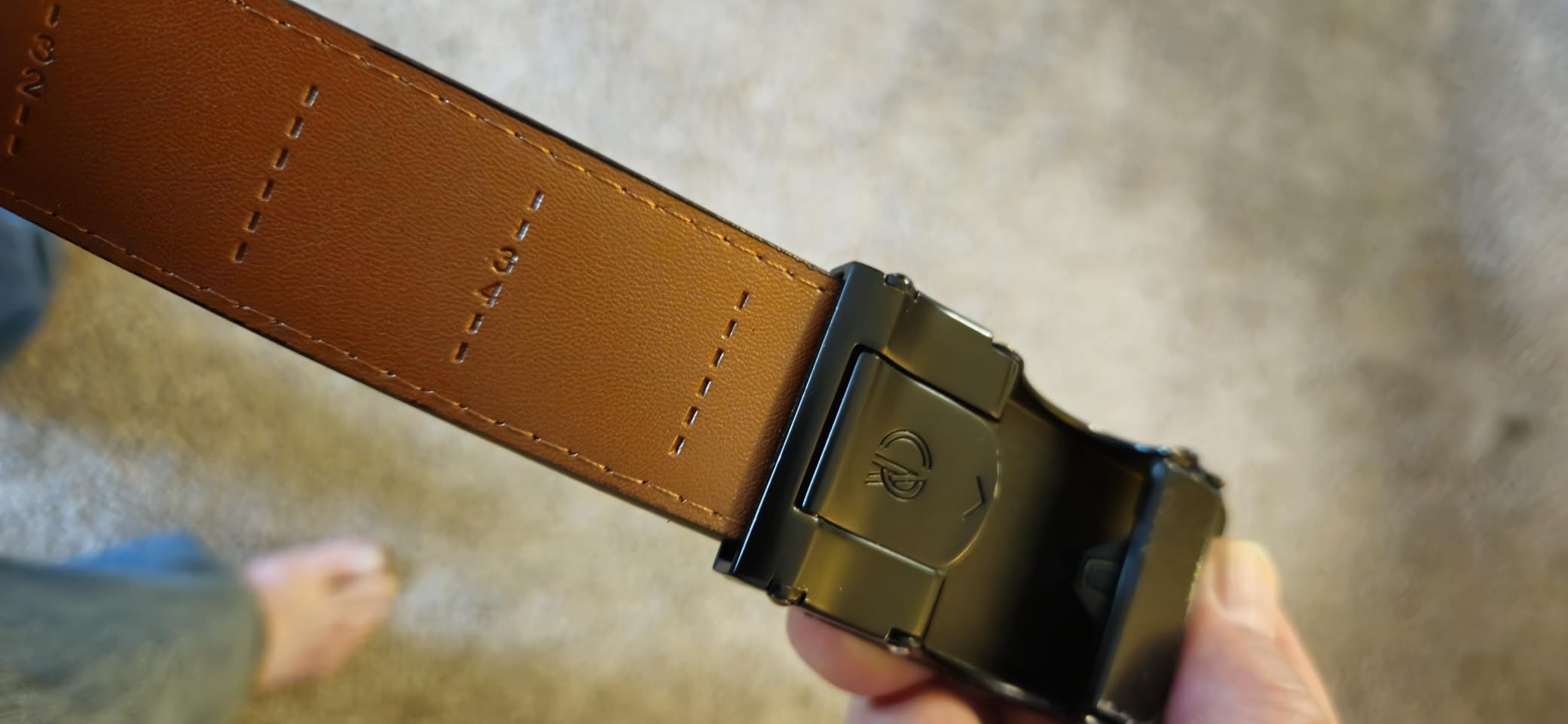 Overall I get too excited about things that just work and work well for what they're intended for and this is one of those things. Its just nice and satisfying and it just works and you dot have to fuss with something too much. The last thing I just realized I like a whole back was when I looked at the back of the belt, on the leather is stamped on the different waist sizes, so when the belt is too long, you can unhook the buckle with it's little teeth that bite into the leather to hold onto it with a little lever on the back side. Then you just cut the leather at whatever number pants size line you want your belt to be, slip the new cut end of the belt back into the beckle and latch the teeth and now your belt is whatever size you wanted it. Obviously you can't make it bigger so I just ordered big but I didn't expect it to be so easy to shorten either which was great. Overall I would buy another one if this one ever wore out or it's so convenient yiu could just get your own new strip of leather and dye and stitch that however you see fit and hook it to the buckle and new belt. I may actually just made different color strips and styles just so I can move the buckle around to different leather. Or I may honestly just buy another color to have options with less work too.