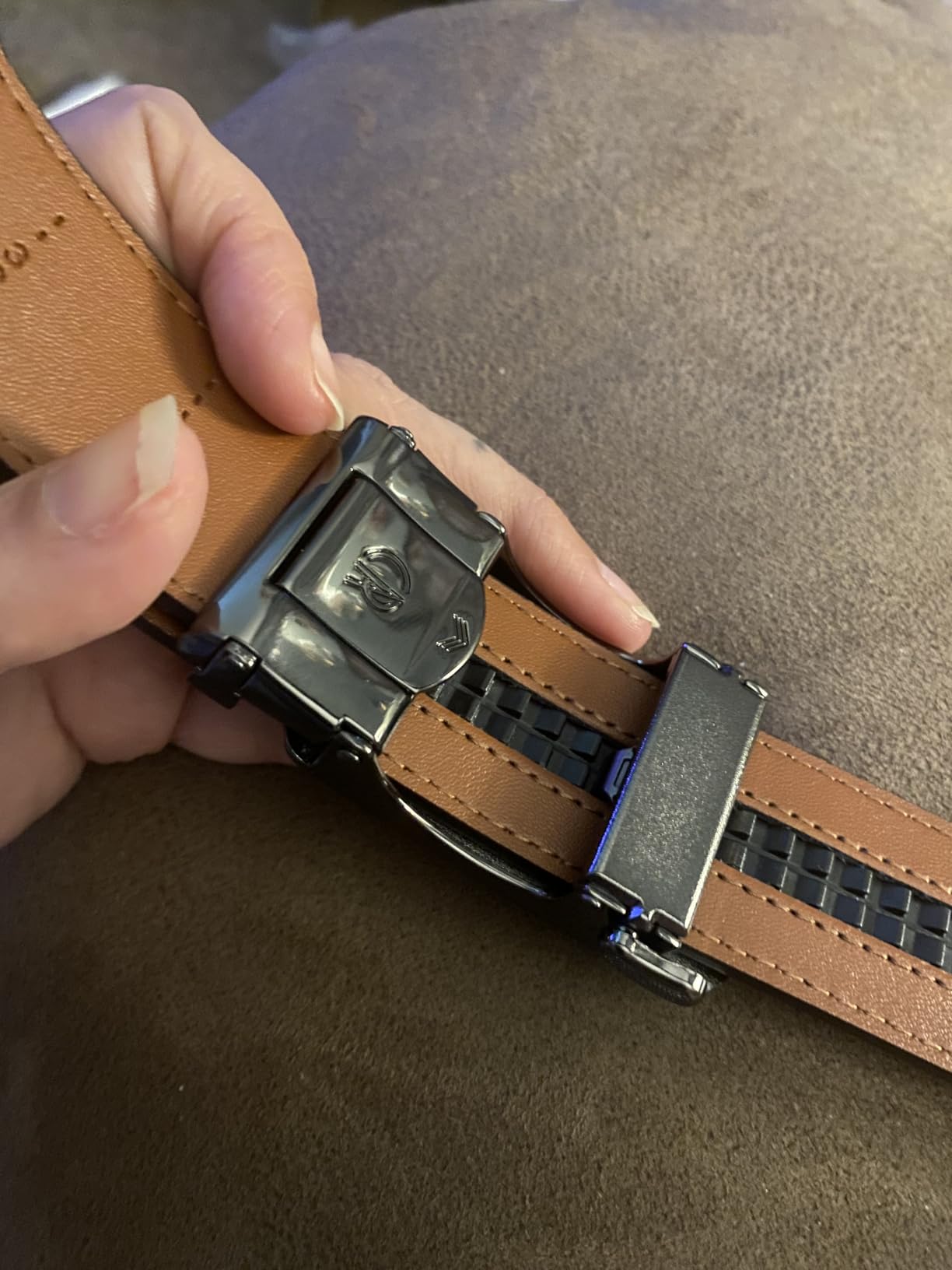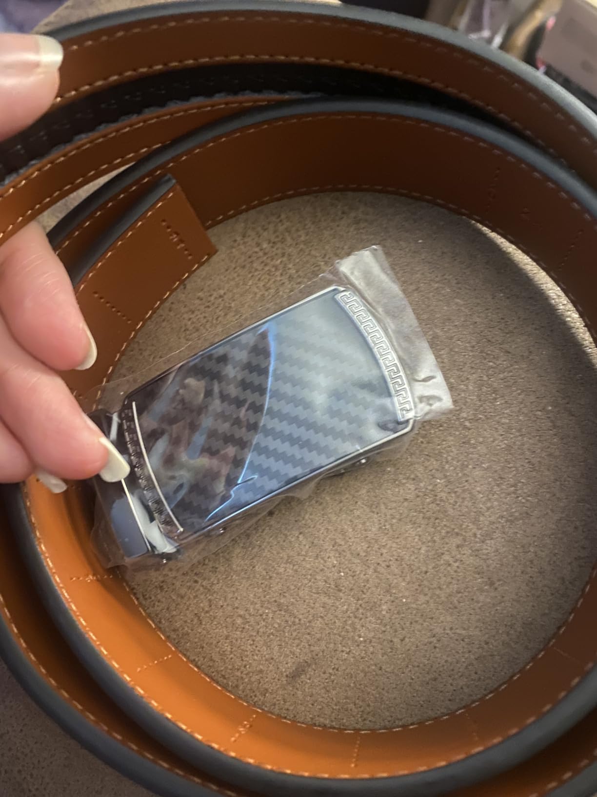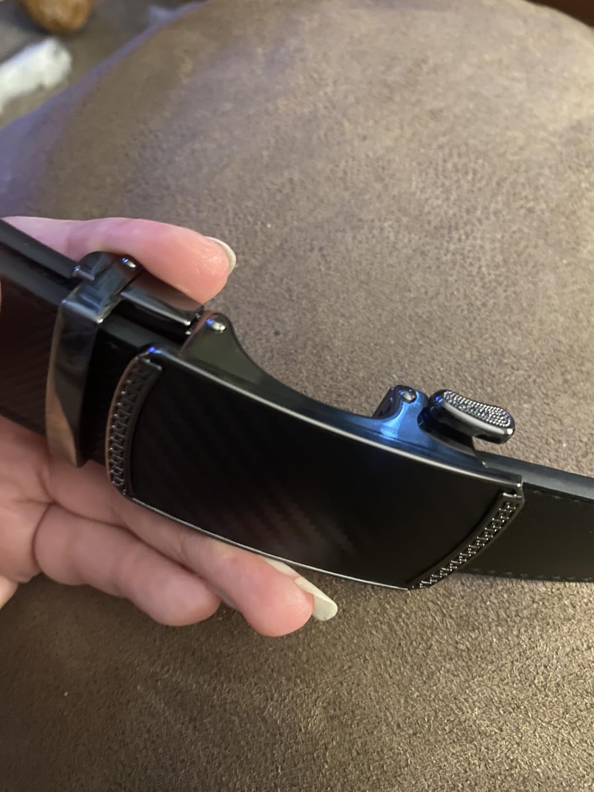 This belt exceeded my expectations in every way. The material—whether leather or a high-quality synthetic—is thick, durable, and clearly built to last. The carbon fiber buckle looks sleek and is extremely well-made, offering smooth, micro-adjustable functionality through a clever ratchet system. A small lever easily releases the grip, while pushing the belt forward tightens it in small, precise increments. I appreciate how simple and fast it is to adjust, whether tightening or loosening. The black horizontal band of teeth on the inside engages seamlessly with the buckle, providing a secure fit. Sizing was easy—I picked my general waist size and trimmed it for a perfect fit. Even the packaging had a premium feel. I was so impressed, I ordered several more in different colors. Highly recommended.